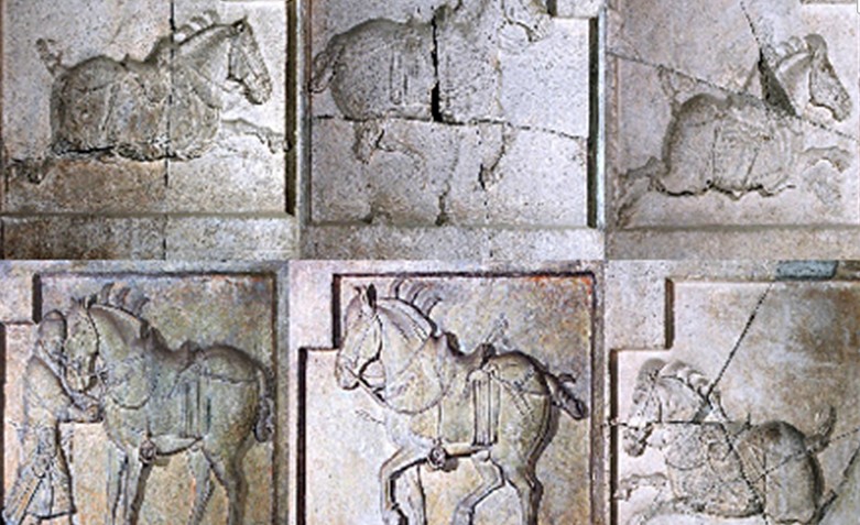 在祭壇東西兩廡房內(nèi)置有6匹石刻駿馬浮雕像,馳名中外,曾有詩云:“秦王鐵騎取天下,六駿功高畫亦優(yōu)。”這是李世民自己選定的題材。他在隋亡以后,為統(tǒng)一割據(jù)的局面,鞏固唐王朝新建的政權(quán),南征北戰(zhàn),馳騁疆場,他騎過的六匹馬,聯(lián)系他的戰(zhàn)叻。據(jù)說當(dāng)時擔(dān)任營山陵使、工部尚書、著名工藝家、美術(shù)家閻立德起圖樣,由筑陵石工中的高手雕鐫而成的。這六具石雕駿馬是在平面上起圖樣,雕刻人馬形狀的半面及細(xì)部,并使高肉突起,稱之浮雕,也叫“高肉雕”。每邊三具,皆背靠后檐墻而立。據(jù)記載,原石在每塊上角有歐陽詢書太宗自撰的馬贊詩,隨后另有殷仲容隸書刻于座上,這些今俱不可見,原詩收入《全唐文》中。六駿的名為“特勒驃”、“青騅”、“什伐赤'、“颯露紫”、“拳毛馬咼”、“白蹄烏”?,F(xiàn)存西安市碑林博物館,其中“颯露紫”、“拳毛馬咼”二駿,于1914年被盜運美國賓夕法尼亞大學(xué)博物館。昭陵六駿刻于貞觀十年,各高2.5米,橫寬3米,皆為青石浮雕,姿態(tài)神情各異,線條簡潔有力,威武雄壯,造型栩栩如生,顯示了我國唐代雕刻藝術(shù)的成就。在“颯露紫”中表現(xiàn)了唐太宗在與王世充作戰(zhàn)時為流矢所中,丘行恭進前為他拔箭那種親切形象。昭陵的這些石刻在品類、造型及題材上,既不取生前儀衛(wèi)之形,也不用祥瑞、辟邪之意,獨具一格,所有石刻都是寫實,富有政治意義的不同凡響之作。