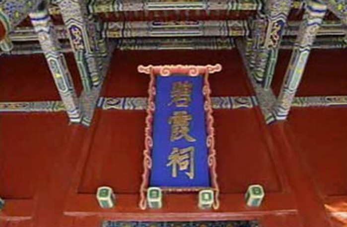 殿內(nèi)槽柱上施四柁隔架斗拱。柱上施井字形天花板,正間內(nèi)斗拱相圍呈八角形藻井,中間高浮雕盤(pán)龍戲珠。正間和西次間均設(shè)石雕仰覆蓮紋須彌座神臺(tái):正間神臺(tái)裝木構(gòu)雕花神龕,祀元君銅像,兩側(cè)為眼光、送生兩神銅像;東次間神臺(tái)供眼光奶奶及二侍女銅像,西次間神臺(tái)供送子娘娘和二侍女銅像。正殿內(nèi)懸康熙帝巨匾“福綏海宇”。