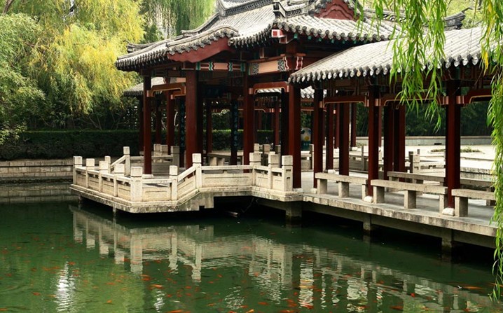 五龍?zhí)?,位于?jì)南舊城西門外,洛源橋北,南臨趵突泉,北接大明湖。潭周名泉眾多,形成五龍?zhí)度?,為?jì)南四大泉群之一,內(nèi)有泉池二十七處。公園的建園風(fēng)格兼具有南北造園之精華,是以潭池溪港等景觀構(gòu)成,質(zhì)樸野逸為特點(diǎn)的園林水景園。此水域風(fēng)景秀麗,柳絲醮波,鳴禽啾啾,荇藻漂浮,錦魚嬉戲,素有“夾岸桃花,恍若仙境”之美譽(yù),風(fēng)景幽雅獨(dú)具特色。