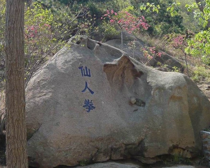 從石門澗逆溪水往山上走,過鰲魚石、剪子峰,來到麻衣山前,這里有麻衣庵的殘?jiān)?。?jù)民國年間的《增修膠志》記載,晉代的陳仲舉、元代的張清源、明代的趙麻衣等名士曾在這里隱居過。庵后的峭壁上,有一懸空石室,室門鑿造得很精致,門高兩米,頂為孤形,有石門框和石雕門檻。在離石室前約3米處有刻有蓮花圖的蓮花石。《增修膠志》記載,在石室與蓮花石之間古有鐵板橋連接,人可攀蓮花石過鐵板橋進(jìn)石室。石室東側(cè)的山壁上刻有“云逍庵”三字。石壁上還有李慶道等人署名的“玉泉觀旨緣”石刻,又有元代大德四年(1301年)孫榮題寫的“太清巖”刻字。庵東側(cè)有 “飛來石”,石前額刻“朝陽洞”三字。庵前有“說法石”,在說法石下,有一石碾底,透出過去這里的人間煙火氣息。庵西側(cè)的高處有一平臺(tái),條石砌的建筑基礎(chǔ)很規(guī)整,站在這里可以東望靈山灣,西望龍灣,這是“望海樓”的故址。