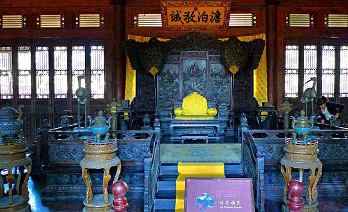 大殿建在大理石砌筑的臺(tái)基上,為青磚布瓦卷棚歇山式建筑, 古樸典雅,莊重肅然。殿內(nèi)陳設(shè)豐富、素雅、凝重,與周圍的環(huán)境十分協(xié)調(diào),顯示出皇家典雅的氣派。殿內(nèi)陳設(shè)有成堂的家具、圖書、鐘表和古玩。殿中懸"澹泊敬誠"匾。中央為紫檀雕欄須彌座地坪,上置有紫檀浮雕耕織圖圍屏、紫檀彌勒寶座、足踏、座褥、靠背、迎手、羽葆、蟠龍、垂思香筒、仙鶴、香幾、印盒等,周圍有薰?fàn)t、爐幾、琺瑯爐、東大案、西大案,案上有鐘表、青花貫耳尊、霽蘭天球瓶、青花雙耳尊、五彩山水鹿頭尊、紫檀雕龍大立柜等。