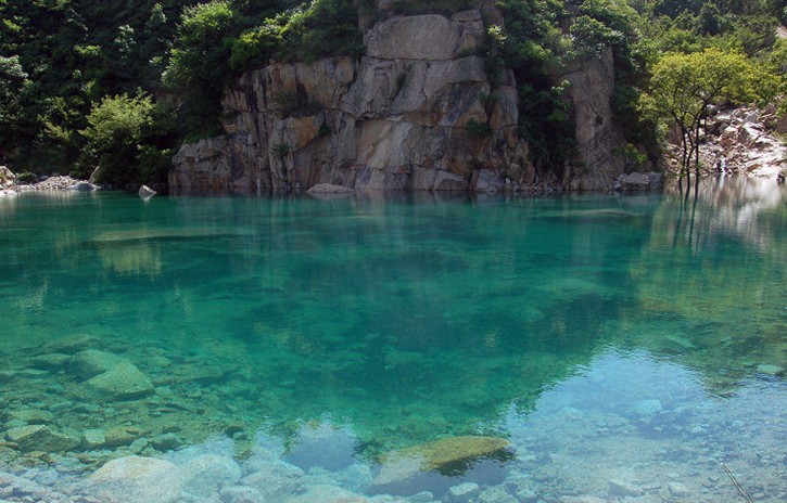 一水始自孫家村村東之菊灣,南有玉筍峰,北有黑虎山,兩山相夾,中為大澗,澗底巨石交錯,姿態(tài)萬千。二水澗中大石壘迭,排空壁立。澗南有巨巖,名錦屏巖,石色蒼翠。巖下潭水,錦巖倒影,波光漣漪三水于1967年建三水水庫,為九水新景。水清澈靛藍(lán),從溢洪壩頂凌空跌落,如珍珠壁簾,晶瑩奪目。