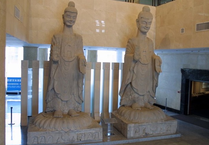 在青島歷史文化博物館的正門大廳內(nèi),矗立著兩尊北魏(公元500—550年)時期的石佛像,距今已有1500余年的歷史。佛像身高一丈八尺,重約30噸,俗稱“丈八佛”。頭部雕高肉髻,面部瘦削清秀,深目高鼻,眉間有白毫相,其神態(tài)祥和、超然。長頸,內(nèi)著僧祗支,胸前束僧祗支帶,外披褒衣博帶式長衣,衣紋雕刻成“v”形斷面。雙手施無畏與愿印。跣足立于蓮花座上,蓮座下雕四方形的須彌座。石佛像造型優(yōu)美,雕刻技法嫻熟,衣紋細(xì)致柔和,神態(tài)栩栩如生。充分表現(xiàn)出北魏孝文帝漢化政策的施行,反映到佛教雕塑藝術(shù)上的風(fēng)格特點。兩尊石佛像最早安放在山東臨淄縣龍泉寺內(nèi)。