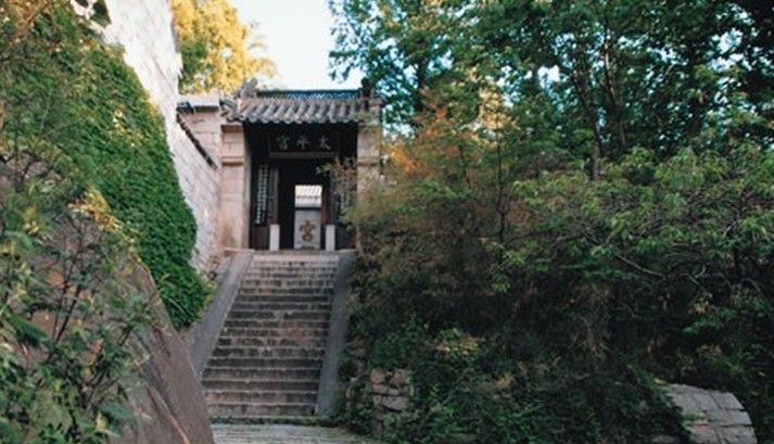 太平宮初名太平興國(guó)院,又稱(chēng)上苑。系宋太祖為華蓋真人劉若拙敕建道場(chǎng),金明昌年間(公元1190~1195年)重修。正殿名三清殿,配殿為三官殿和真武殿,坐落在嶗山東部上苑山北麓、仰口灣畔。 宮西絕壁矗立,下有天然石洞。洞內(nèi)縱橫各數(shù)丈,高敞如廈;洞頂鐫刻“混元石”三字及星斗圖案;洞旁眠龍石上,鐫“猶龍洞”三字。宮北山坡下有澗水噴涌,相傳曾有農(nóng)人見(jiàn)白龍游泳其中,名白龍澗。澗底巨石累累,橫跨兩岸,水從石隙下瀉,稱(chēng)仙人橋。過(guò)橋山坡有巨石,上刻邱處機(jī)詠嶗山七絕20首及序。 宮東北奇峰突起,形同巨獅,張嘴作怒吼狀,名獅子峰。峰巔崗巒平敞,云氣彌漫,有“獅嶺橫云”勝景。
