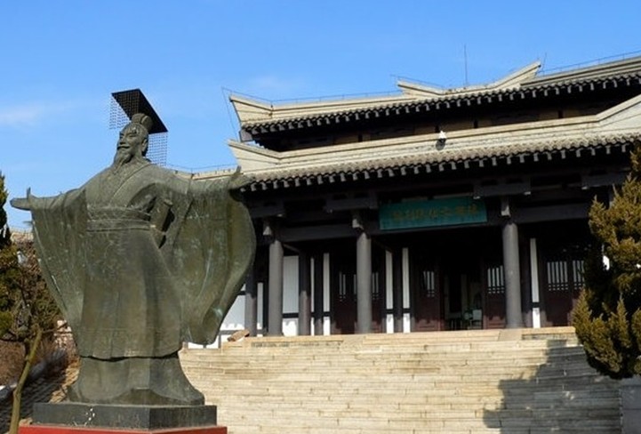 秦闕是從北路登瑯琊臺(tái)的門(mén)。闕由四柱撐一橫匾,以簡(jiǎn)潔樸素的造型體現(xiàn)著秦代建筑的凝重大氣。匾額“瑯琊臺(tái)”三字由著名畫(huà)家劉海粟題寫(xiě)。進(jìn)闋門(mén)走不多遠(yuǎn),便登上“觀龍橋”,站在橋上,回望龍灣里群龍聚會(huì),可見(jiàn)“龍”們都從闋前經(jīng)過(guò),好像是在接受檢閱,其場(chǎng)面非常隆重和莊嚴(yán)。橋右前方路西側(cè)有一片黑瓦房,綠樹(shù)和菜圃環(huán)繞,這是秦代民居。進(jìn)入民居庭院和室內(nèi),仿佛走進(jìn)了兩千多年前秦代的民間生活之中。