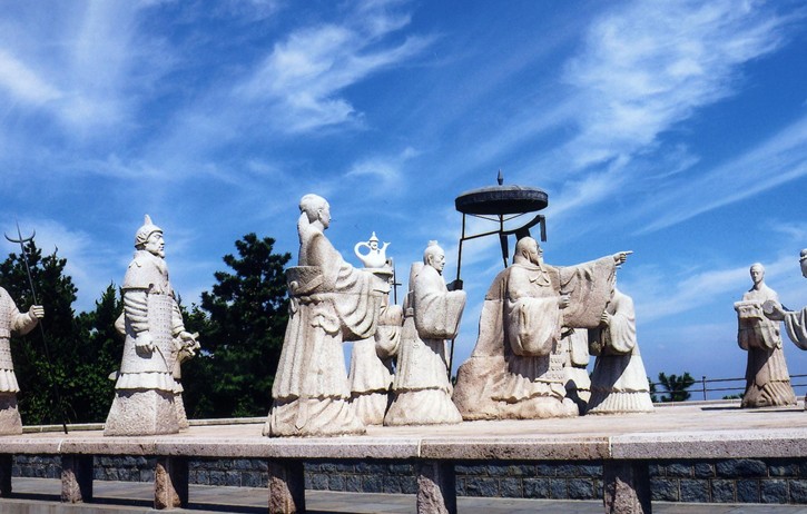 在瑯琊臺(tái)頂,共有石雕像14尊:秦始皇、徐福、胡亥、李斯、趙高和文武官員、武士、侍女、侍從等。群雕生動(dòng)地表現(xiàn)了公元前210年秦始皇第三次巡游瑯琊時(shí),徐福向秦始皇講述海上求仙經(jīng)過(guò)的場(chǎng)面。版權(quán)所有山東聊城聊之旅國(guó)際旅行社有限公司,轉(zhuǎn)載必究!作品的整體氣韻與古臺(tái)、高天、大海和群山的背景渾然融合而又相互襯托,氣勢(shì)宏大。群雕把一個(gè)充滿傳奇色彩的歷史場(chǎng)面燦然凝固在瑯琊臺(tái)上。