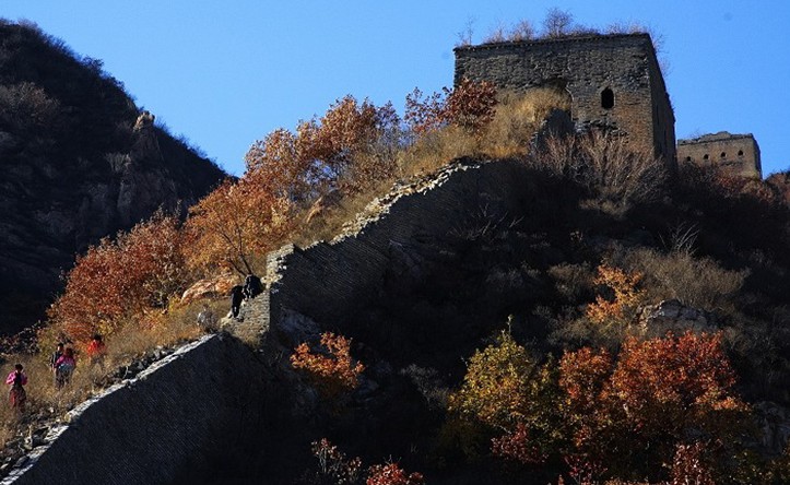 由關口順長城南上,沿途城墻至今保存完好,長城垛口隨山勢高低起伏,呈鋸齒狀,形勢別致而壯觀。沿線有兩座建筑獨特的敵樓,一是監(jiān)獄樓,此樓無門,只在正上方有一眼通氣孔,為古代戰(zhàn)時囚禁戰(zhàn)俘之用。通氣孔距地面1丈8尺,四壁光滑,難以攀附,戰(zhàn)時擒獲的敵人,由孔投入,絕難逃脫;二是七十二券樓,建筑造型在長城上獨一無二,此樓由大小七十二拱券結構而成,造型美觀堅固,組合巧妙,實屬長城建筑的一大奇觀。