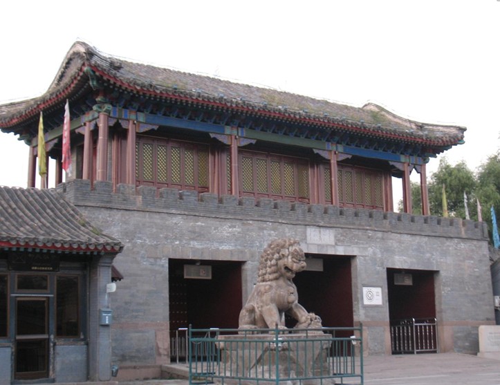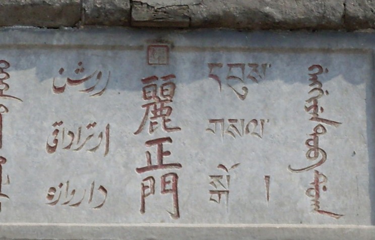 門前列石獅和下馬碑,迎面有紅照壁,門上有閣樓,下有3門,高敞宏偉。中門上方有乾隆題額“麗正門”三字,取《易經(jīng)》“日月麗乎于天”之意,用漢、滿、蒙、藏、維五種文字刻成。它和門內(nèi)上方乾隆題詩“兩字新題標(biāo)麗正,車書恒此會(huì)遐方”,象征著國內(nèi)各民族團(tuán)結(jié),國家強(qiáng)盛、統(tǒng)一。