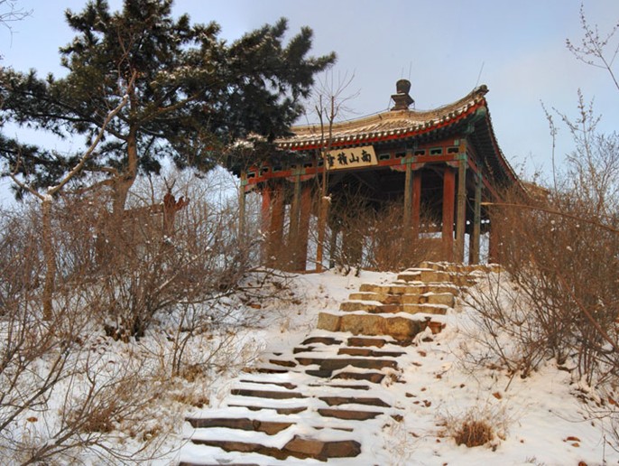 南山積雪亭位于山莊正北、青楓綠嶼南側(cè)的山頂上,是一處借景之作,為“康熙三十六景”第十三景。是山莊的制高點(diǎn)之一。 南山積雪亭為方形四角攢尖式敞亭,面積較大,在此可一覽眾峰?!澳仙椒e雪”是觀賞山莊初冬雪景為命題的一組苑景。塞北高寒,山莊之南,峰嶺環(huán)列,嶺上積雪經(jīng)久不消。登亭遙望,群山上的積雪“皓潔凝映,晴日朝鮮,瓊瑤失素”。直到初春時(shí)節(jié),仍是“不改冰霜積雪冬”的景象。