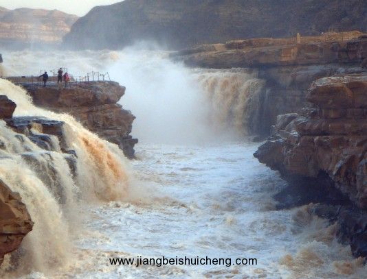 壺口瀑布是黃河中游流經(jīng)秦晉大峽谷時形成的一個天然瀑布。西臨陜西省宜川縣,東瀕山西省吉縣,距陜西省宜川縣城40公里,距山西吉縣城西南約25公里。瀑布寬達(dá)50米,深約50米,最大瀑面3萬平方米。是中國僅次于貴州省黃果樹瀑布的第二大瀑布。滾滾黃河水至此,300余米寬的洪流驟然被兩岸所束縛,上寬下窄,在50米的落差中翻騰傾涌,聲勢如同在巨大無比的壺中傾出,故名“壺口瀑布”。兩大著名奇景“旱地行船”和“水里冒煙”,更是罕見。亞洲飛人柯受良和黃河小子朱朝暉先后駕駛汽車和摩托車成功飛越黃河壺口瀑布景區(qū)。黃河壺口瀑布景區(qū)面積約100平方公里,為陜西省和山西省共有著名風(fēng)景名勝區(qū),1988年被定為國家重點(diǎn)風(fēng)景名勝區(qū),現(xiàn)為國家4A級景區(qū)。 此地兩岸夾山,河底石巖上沖刷成一巨溝,寬達(dá)30米,深約50米,滾滾黃水奔流至此,倒懸傾注,若奔馬直入河溝,波浪翻滾,驚濤怒吼,震聲數(shù)里可聞。其形如巨壺沸騰,故名壺口。春秋季節(jié)水清之時,陽光直射,彩虹隨波濤飛舞,景色奇麗。明陳維藩《壺口秋風(fēng)》詩有“秋風(fēng)卷起千層浪,晚日迎來萬丈紅”句,可謂真實寫照。