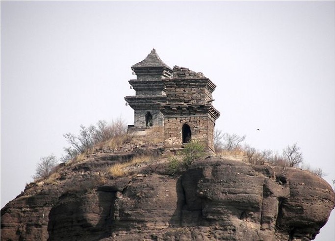 東、西、南三面墻是青磚壓縫,北墻齊縫直茬。1976年前北墻裂縫較大,寬處大約有20多公分,唐山大地震以后,磚塔不但沒倒,裂隙反而拼合。 峰頂各有磚塔一座,故名雙塔山。兩峰高低大體相同;北峰粗大,高40余米,周長(zhǎng)74米。南峰上粗下細(xì),周長(zhǎng)34米。雙塔山陡直而立,高不可攀,近代無人上去過,峰頂磚塔何人、何時(shí)、何故所建,不得而知,一直是個(gè)謎;今人用望遠(yuǎn)鏡觀測(cè),北峰頂?shù)拇u塔高約2米,圓錐形,無門。南峰頂磚塔坐北朝南,高5米余,方形,邊長(zhǎng)2米多,門高約1.5米,寬1.3米,四角置木據(jù),有鐵棍挑出,上掛銅鈴。東、西、南三面墻是青磚壓縫,北墻齊縫直茬。1976年前北墻裂縫較大,寬處大約有20多公分,唐山大地震以后,磚塔不但沒倒,裂隙反而拼合。