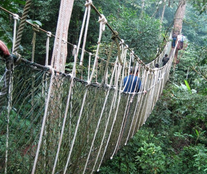 在導(dǎo)游小姐的帶領(lǐng)下,同伴們紛紛走上空中走廊。說是走廊,其實(shí)是一種用鋼索拉建起來的吊橋。一腳踩上去,竟有些站立不穩(wěn),失去了堅(jiān)實(shí)的土地,我在搖籃般的吊橋上晃晃悠悠,心里只想早點(diǎn)結(jié)束這段行程。版權(quán)所有山東聊城聊之旅國(guó)際旅行社有限公司,轉(zhuǎn)載必究!一不留神,差點(diǎn)跌了一跤。抬頭一看,導(dǎo)游小姐早已走到吊橋中央,她耐心地笑著說:不用怕,雙手扶著兩邊慢慢來。原來,這看似簡(jiǎn)單的走廊對(duì)人也是種考驗(yàn)。我重新抖擻精神往前行走,為這段人造的險(xiǎn)途劃上了完美的句號(hào)。