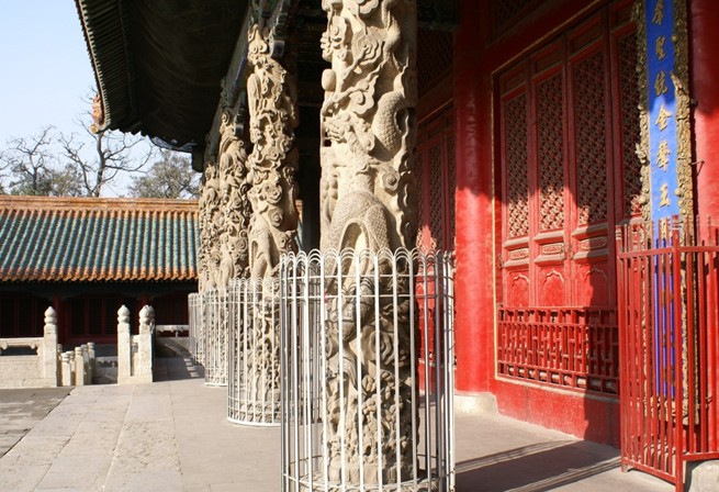 大成殿為孔廟之主殿,唐代稱“文宣王殿”。“大成”乃因宋徽宗趙倩尊孔子為“集古圣先賢之大成”而改名為“大成殿”,并御書匾額。大成殿不僅殿宇宏大,裝飾華麗,為全國孔廟之冠,而且此殿前檐十根雕龍石柱,龍姿飛揚,為宮殿建筑中前所未見,連紫禁城的龍柱也相形見細。據傳每當皇帝前來祭孔時,要將龍柱用紅縷包裹起來,以免皇帝發(fā)現(xiàn),犯殺頭之罪。殿內正中奉把孔子塑像,兩旁為四配和十二哲的塑像。殿前東西民廊原供孔門弟子及儒家歷代先賢,現(xiàn)已辟為陳列室,陳列著歷代碑刻,為書法、繪畫、雕刻的藝術寶庫。寢殿后的圣跡殿,藏有明代石刻連環(huán)畫120幅,記述了孔于的業(yè)跡。故宅井后的魯壁為秦始皇焚書坑儒時,孔子第九代孫孔鮑收藏《尚書》、《禮記》、《論語》、《孝經》等的夾墻,人們?yōu)榱思o念孔鮑保護古代文化的功績,特地修建了這個魯壁。