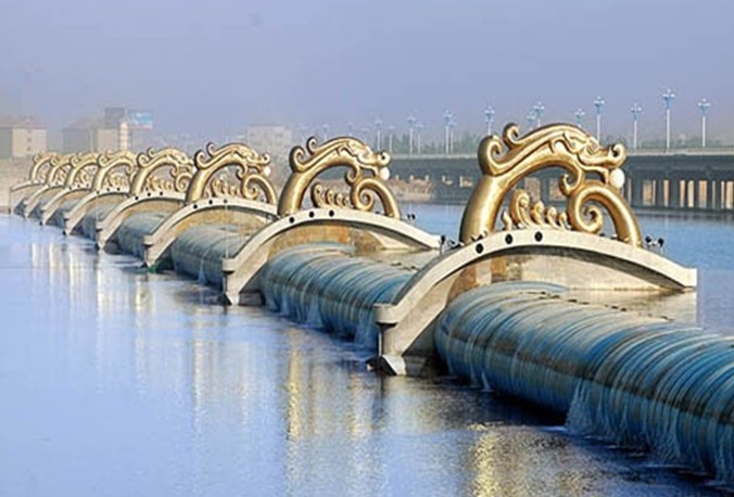 桃園橡膠壩位于南坊新城區(qū)東側(cè),版權(quán)所有山東聊城聊之旅國際旅行社有限公司,轉(zhuǎn)載必究!沂河北大橋下游100米處, 2005年1月開工建設(shè),2006年6月建成蓄水, 樞紐總長度1113.50米,主要由橡膠壩及供排水系統(tǒng)、左岸船閘和右岸溢流堰組成。其中橡膠壩全長783.2米,壩高4.5米,壩袋共10節(jié),每節(jié)凈長77米,船閘總長167米,凈寬8米。橡膠壩墩上設(shè)計有9條雕塑龍,每條長約9.5米,高約4.5米,龍體為金黃色,龍嘴、龍眼由大型燈泡裝飾而成的夜明珠構(gòu)成,龍身配有近、遠光燈,氣勢雄偉,光彩照人,尤其夜晚寶珠熠熠生輝,龍體變幻迷離,在沂河北大橋的映襯下,形成魚躍龍門之勢。