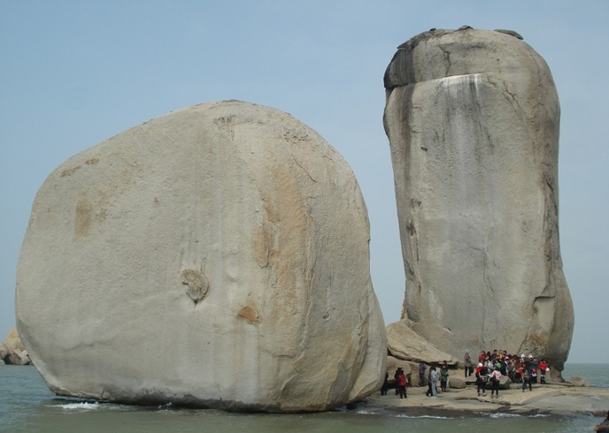 從看澳村岸邊坐渡船,十幾分鐘就到達(dá)礁石上,礁石底部是一組平坦完整的巖石。兩個(gè)石柱均由粗粒灰白色的花崗巖組成 東側(cè)的一個(gè)高達(dá)33米,胸寬9米,厚8米,周長(zhǎng)57米;西側(cè)的一個(gè)高17米,胸寬15米,厚8米周長(zhǎng)39.9米。兩個(gè)石柱的底部都是近似四方形體,直立在礁石上。據(jù)地質(zhì)學(xué)家考證是世界上最大的花崗巖球狀風(fēng)化海蝕柱。
