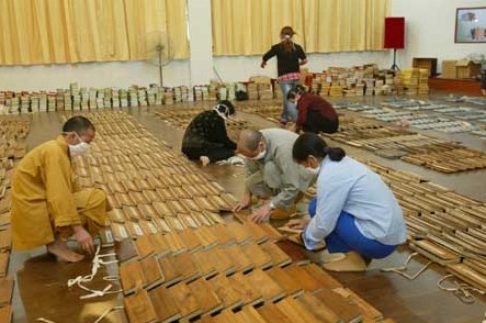 這里還存有用血書寫的經(jīng)書557冊。這是涌泉寺“三寶”之一。這些血經(jīng)系清光緒年間,華能和尚刺臂血,由信士王谷楷書“大乘般若波羅密真經(jīng)”全部,定慧大師刺血、克定書寫“佛說四十二章經(jīng)”等。用鮮血寫成幾百冊佛經(jīng),需要很長的時間和大量的鮮血,這就需要刺血的人長期不吃鹽,血在書寫時才不會很快凝固。這些佛經(jīng)中,一部分字呈鮮紅色,是因為在血中調(diào)了朱砂;一部分暗紅色,則是不調(diào)朱砂的。血書數(shù)百冊佛經(jīng),表達了血書人十分的虔誠和不凡的毅力。