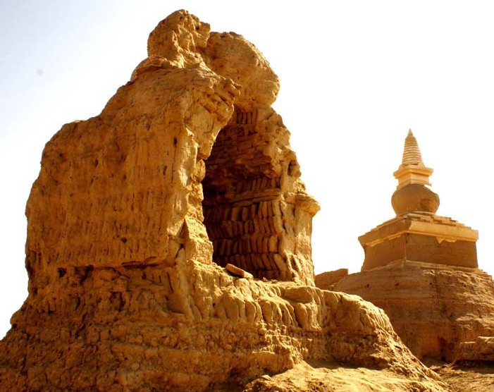 1350年前后,這里的情況發(fā)生了巨大的變化。昔日的綠洲,被沙漠吞噬,變成了一片荒漠。昔日繁華昌盛的黑水城也變成了一座廢城?,F(xiàn)在它們的痕跡依稀可辨。磚石,瓦塊,陶瓷殘片,鐵器,雕刻,泥佛,風化的白骨,破裂的石磨,塊壘等當年的遺物。在古城遺址的西北角上,端坐著12米高的西藏覆缽式佛塔,古樸,圓融,安詳,是黑城的標志性建筑。城內,荒涼滿目,流沙下遍布官邸、寺廟和民居的頹垣斷壁,到處都散落著各種瓷器和碎片。黑釉刻花、白釉褐彩,以及鈞瓷和南方的龍泉瓷等等。城外還有幾座殘缺不全的喇嘛塔,像是守城的衛(wèi)士肅然而立。