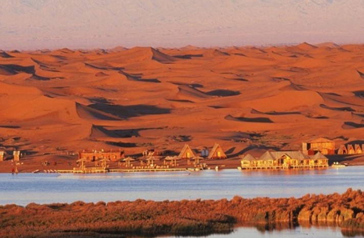 騰格里沙漠月亮湖旅游區(qū) 位于中國內(nèi)蒙古阿拉善盟境內(nèi)騰格里沙漠腹地,月亮湖是距離國內(nèi)各大城市半徑最短的沙漠探險營地,是現(xiàn)代都市人尋求緊張競爭生活之外的驚險刺激與徹底放松身心的最佳游程。月亮湖有三個獨特之處:一是形狀酷似中國地圖:站在高處沙丘一看,一幅完整的中國地圖展現(xiàn)在眼前,蘆葦?shù)姆植几菍⒏魇^(qū)一一標明;二是湖水天然藥浴配方:面積三平方公里的湖水,版權(quán)所有山東聊城聊之旅國際旅行社有限公司,轉(zhuǎn)載必究!富含鉀鹽、錳鹽、少量硭硝、天然蘇打、天然堿、氧化鐵及其它微量元素,與國際保健機構(gòu)推薦藥浴配方極其相似。湖水極具生物凈化能力,能迅速改善、恢復(fù)自然原生態(tài)本色。三是千萬年黑沙灘:長達一公里,寬近百米的天然浴場沙灘。推開其表層,下面是厚達十多米的純黑沙泥,其質(zhì)地遠超死海的黑泥,更是天然泥療寶物。景區(qū)水、電、通訊設(shè)施齊備,交通便利,有黑色油路直達景區(qū)接待站。距銀川機場、火車站130公里左右。