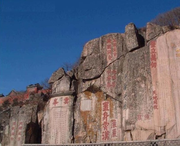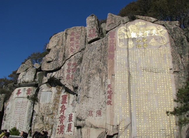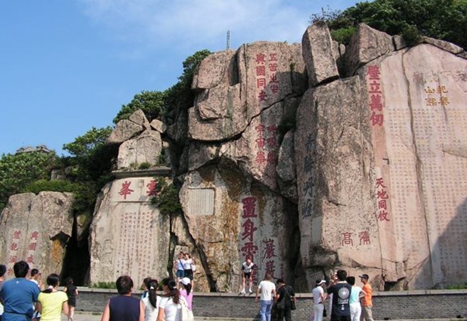 大觀峰和云峰上題刻遍布,版權(quán)所有山東聊城聊之旅國(guó)際旅行社有限公司,轉(zhuǎn)載必究!重重疊疊,能識(shí)者80余處。“天日蒼茫”、“呼吸宇宙”、“置身霄漢”、“青碧丹崖”等大字與《紀(jì)泰山銘》輝映;唐劉仁愿、宋趙明誠(chéng)、元徐世隆、明朱衡、清阮元及施閏章等歷代名流題刻歷歷在目。