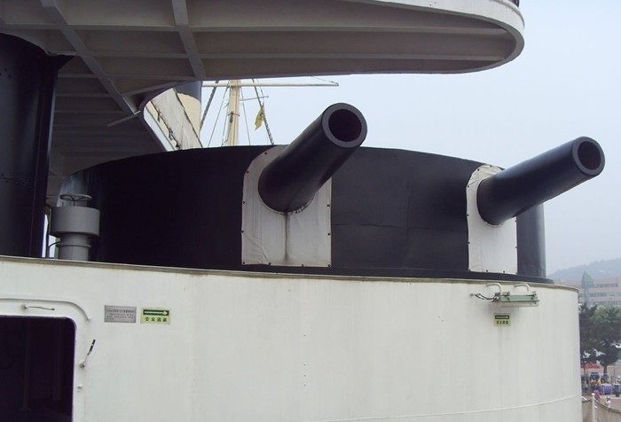 3磅(47毫米)單管哈乞開斯式機(jī)關(guān)炮2門,外形與6磅炮相同。同樣由英國阿姆斯特朗公司制造,口徑47毫米,炮管長2012毫米,版權(quán)所有山東聊城聊之旅國際旅行社有限公司,轉(zhuǎn)載必究!炮管重229千克,彈藥分為開花彈和鋼彈,分別重1.405和1.46千克,在274米距離上,可擊穿90毫米厚鋼板。射速為每分鐘20發(fā),射程4575米。6磅與3磅炮均安裝于“定遠(yuǎn)”級軍艦的尾樓甲板上。