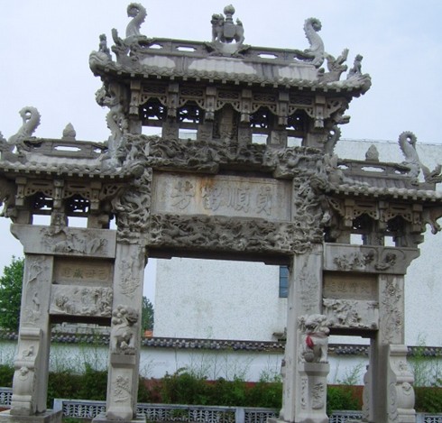石坊坐西朝東,通高約12米,寬9.35米,全用石灰石壘疊而成。其結(jié)構(gòu)可分為座、身、頂三部分。坊座為4塊條狀基石及4組圓雕石獅,坊身是由4根立柱組成的正門和兩個邊門,坊頂為單檐廡殿式。上部兩面均刻“圣旨”二字,兩面正樓匾分別鐫刻“節(jié)動天褒”、“貞順留芳”楷書大字,題跋為“旌表儒童馬若愚妻王氏節(jié)孝坊”,次樓匾上的刻字分別是“大清道光”、“已丑歲建”。 版權(quán)所有山東聊城聊之旅國際旅行社有限公司,轉(zhuǎn)載必究!坊上題字傳為高密翰林單蘭亭所書。石坊的雕刻內(nèi)容豐富多彩,既有神話傳說中的仙人異獸,又有現(xiàn)實中的風(fēng)土人情。藝人采用淺浮雕、高浮雕、透雕、圓雕等多種技法,在不同部位刻畫了車馬人物、飛禽走獸、花鳥魚蟲、風(fēng)云水月等數(shù)十種景物?,F(xiàn)擇其要者,分別介紹如下: