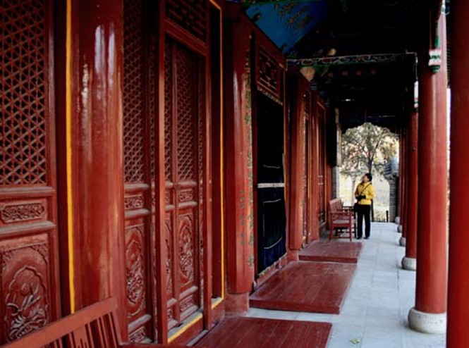 大殿(即禮拜殿)是全寺的主體建筑,建筑面積六百多平方米,能同時(shí)容納七、八百人禮拜,由前殿、中殿和望月樓三個(gè)相連的部分組成,周?chē)⒅?,立柱下石鼓承托。前殿面闊五間,進(jìn)深五間,中殿面闊五間,進(jìn)深二間整個(gè)大殿平面呈“凸”字形。群眾中還有“米海拉布”(壁龕的音譯)。整個(gè)大殿平面呈“凸”字形。群眾中還有“米海拉布”為“主”字的一點(diǎn),望月樓為“主”字的上橫,中殿為“主”的中橫,前殿為“主”字下橫,進(jìn)殿禮拜的主道為“主”字豎筆,整個(gè)殿身平面為“主”字形的說(shuō)法,正符合禮拜殿是“主的天房”的意思。