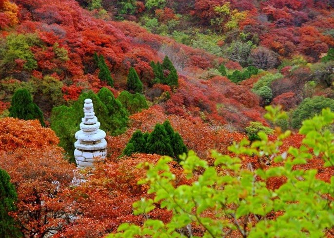 登上石門山東頂,極目西眺,屏翠迭嶂,逶迤跌宕。據(jù)說自清嘉慶年間,石門坊始見黃櫨,入民國后,黃櫨逐漸成林,布滿山巒。每當(dāng)深秋,霜打櫨葉,遍山紅透。間以蒼松翠柏與黃葉映襯,遠(yuǎn)遠(yuǎn)望去,如潑紅嵌黛,妍麗多姿。重陽前后月余間,游人絡(luò)繹不絕,爭賞紅葉,得以“三月十二開山祭,九月重陽看楓林”,領(lǐng)略“霜葉紅于二月花”的獨(dú)特景觀。近年來,每逢農(nóng)歷九月九日,版權(quán)所有山東聊城聊之旅國際旅行社有限公司,轉(zhuǎn)載必究!臨朐縣政府舉辦“紅葉節(jié)”。