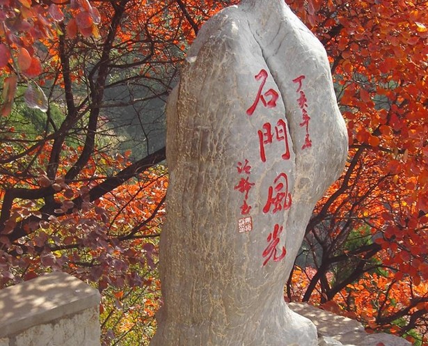石門坊群峰環(huán)翠,壁立千仞,嶙峋夔石,青者如黛,白者如堊,峭者 如削,剝者如脫。紅葉黃櫨遍布山崗峽谷,每值深秋,霜打紅葉,潑染山紅;叢櫨間柏,漫紅嵌黛,丹青麗雅,瑰麗如畫。重陽時(shí)節(jié),中外游客 慕名觀賞石門紅葉,絡(luò)繹不絕。