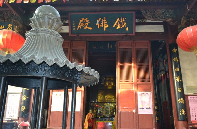 鐵佛殿內(nèi)有鐵佛一尊,稱“阿彌陀佛”,疊掌跏趺坐于蓮花臺上,外披泥貼,法相莊嚴。鐵佛高5.3公尺,頭部實心,身軀空心,人立其肩上,伸手摸不到頭頂,估計重量達十萬斤以上。清乾隆時陳云程《閩中摭聞》載,鐵佛殿前柱子兩側刻有明末舉人曾異所撰楹聯(lián):“古佛由來皆鐵漢,凡夫但說是金身。”
