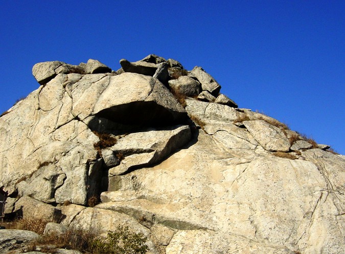 韓信點(diǎn)將臺(tái):位于崮山頂峰北部,面向山谷,臺(tái)面平整如刀削,鄰近懸崖之處,一道石壁突兀而起,臺(tái)下是懸崖峭壁,右側(cè)有數(shù)級(jí)臺(tái)階,也是天然形成。