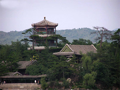 山區(qū)位于山莊西北部,面積443.5萬平方米。山區(qū)占了整個園林面積的4/5。從西北部高峰到東南部湖沼、平原地帶,相對高差180米,形成了群峰環(huán)繞、色壑縱橫的景,山谷中清泉涌流,密林幽深。當(dāng)年利用山峰、山崖、山麓、山澗等地形,修建了多處園林、寺廟。避暑山莊周圍寺廟共占地47.2萬平方米,博仁寺、博善寺、普樂寺、安遠(yuǎn)廟、普寧寺、普佑寺、廣緣寺、須彌福壽之廟、普陀宗乘之廟、廣安寺、羅漢堂、殊像寺等12座金碧輝煌、雄偉壯觀的喇嘛寺廟群,是清政府為安撫中國西北蒙、藏等少數(shù)民族,加強邊疆管理而建造的皇家寺廟。寺廟之集中,規(guī)模之宏大,建筑之精湛,寺廟中大量佛像、祭器制造技藝之高超,使其成為藏傳佛教圣地之一。山區(qū)多處園林解放前多遭破壞,但現(xiàn)在山區(qū)景物仍然十分迷人,其中最引人注目的是遙相對立的兩個山峰上的亭子,一個叫“南山積雪”,一個叫“四面云山”。在亭子上遠(yuǎn)眺,山莊的各風(fēng)景點,山莊外的幾座大廟,以及承德市區(qū),周圍山上的奇峰怪石,都可以一覽無余。在另一座山峰上還有一座亭子叫“錘峰落照”,在這里磬錘峰首先映入眼簾,每當(dāng)夕陽西照,磬錘峰被紅霞照得金碧生輝,故名“錘峰落照”。