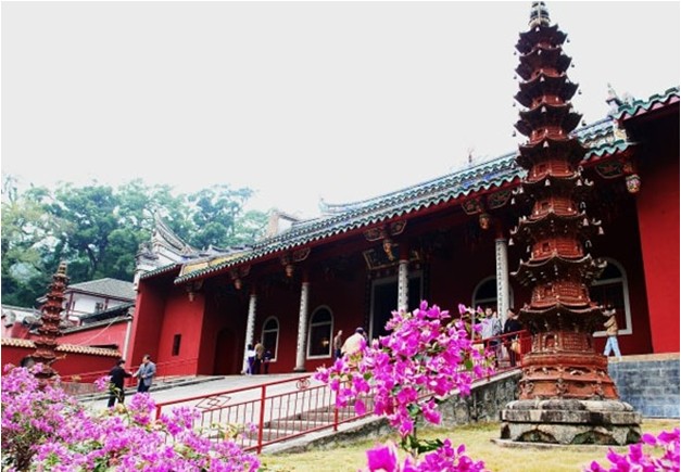 涌泉寺山門保留著唐朝建筑風(fēng)格,為一有框無門的空門,石門柱上鐫刻著一副短聯(lián):“凈地何須掃,空門不用關(guān)”。此聯(lián)構(gòu)思奇巧,意寓在涌泉寺山門東邊,有一石砌拱門,上書“靈源深處”。傍崖而下石階60余級,中裂一澗,寬約3米,深約10米,似石洞,故名“靈源洞”。版權(quán)所有山東聊城聊之旅國際旅行社有限公司,轉(zhuǎn)載必究!因為“喝水巖”石刻,這一帶又統(tǒng)稱“喝水巖”。靈源洞兩側(cè),薈萃了自宋以來摩崖石刻200多段,約占鼓山現(xiàn)存摩崖題刻的一半,行、草、隸、篆諸體俱備,猶如一座天然石刻書法寶庫,譽(yù)為“東南碑林”。題刻中有宋刻近百段,元刻12段,明刻30余段,清朝至今百余段,其中尤以宋代名書法家蔡襄的“忘歸石”,施元長的“喝水巖”以及理學(xué)家朱熹,民族英雄李綱和當(dāng)代郭沫若等題詠石刻最為著名
