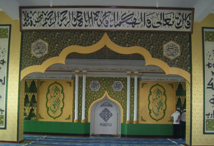 遠(yuǎn)遠(yuǎn)望去,清真寺的塔樓和月牙標(biāo)志十分醒目。四周院墻和古式殿宇高高矗立。這座寺院離路邊不遠(yuǎn),卻高出路面十多米,所以必須沿著一條向北延深的小巷向高處走百十多米,方可到達(dá)山門(mén)口。這里,環(huán)境清靜,境界安謐。進(jìn)入山門(mén)后,便可見(jiàn)院內(nèi)矗立著牌匾。再往里走,就可見(jiàn)到清真寺大殿。