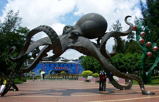 廈門(mén)海底世界占地17.5公頃,總建筑面積7500平方米。它是由新加坡華僑與鼓浪嶼風(fēng)景區(qū)建設(shè)開(kāi)發(fā)公司合作興建的,總投資1000萬(wàn)美元。這座花壇簇?fù)淼暮K{(lán)色水晶宮建筑,第一期工程先后建成了海洋館、企鵝和淡水魚(yú)館。其入口處在主體建筑外60米地方有一個(gè)設(shè)計(jì)獨(dú)特、別具一格、張牙舞爪的章魚(yú)雕,高6米、跨徑11.2米。它是廈門(mén)海底世界的標(biāo)志性建筑,也是游客們首先拍照留念的景觀。