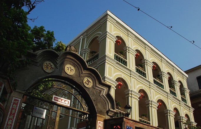 中樓是一幢仿古大屋頂宮殿式建筑,采用重檐歇山頂,四角高高翹起,門、窗、廊、廳的楣上均掛水泥透雕掛落飛罩,檐角均飾纏枝花卉或吸水蛟龍?zhí)袅喝柑婢荦堷P飾件。特別是屋頂下裝飾二個(gè)藻井,井壁上繪中國(guó)花鳥畫,外形又頗像亭子,非常突出。走廊外沿裝飾斗拱掛落,花籃垂柱,把中樓裝點(diǎn)得十分民族化。遠(yuǎn)遠(yuǎn)望去,這幢建筑頗有氣勢(shì),又穩(wěn)重脫俗。