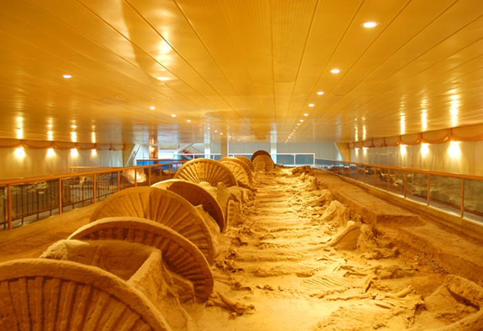 殉馬坑成“∏”形圍繞在該墓的東、西、北三面。東西各長70米,北面長75米,寬5米。東面早年被毀,1964年發(fā)掘了北面54米,發(fā)現(xiàn)殉馬145匹。1972年又發(fā)掘清理了西面南端30米,發(fā)現(xiàn)殉馬83匹。據(jù)此排列密度推算,全部殉馬當在600匹以上。馬分兩行,馬頭向外,昂首側(cè)臥作奔走狀,版權(quán)所有山東聊城聊之旅國際旅行社有限公司,轉(zhuǎn)載必究!在最前面的五匹,頸系有銅鈴。殉馬排列井然有序,個個呈臨戰(zhàn)威姿。經(jīng)鑒定,殉馬全系壯年馬,是被處死后,人工排列而成。