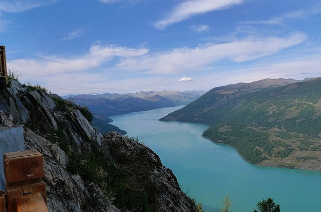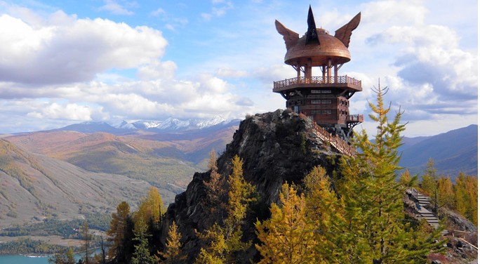 觀魚(yú)亭建于海拔2030米的哈拉開(kāi)特(蒙古語(yǔ)意為駱駝峰)山頂上,與湖面的垂直落差達(dá)600多米,因處于觀察“湖怪”的最佳位置,故得名觀魚(yú)亭。去觀魚(yú)亭有兩條路可供選擇:一條是乘汽車從山后繞行到山腰;另一條是從湖出水口山前專為爬山者鋪設(shè)的石階盤(pán)旋步行而上。登上湖西邊山頂?shù)?ldquo;觀魚(yú)亭”,可觀看喀納斯湖的整體美景。其一可鳥(niǎo)瞰喀納斯湖,四分之三的湖面盡收眼底。湖面呈綢緞般光滑平靜,宛如一塊色彩斑駁的翡翠鑲嵌在山谷之間,并向下游河谷蜿蜒流淌,波光閃耀,飄散著童話般的色彩。順河水之勢(shì)望去依稀可見(jiàn)神仙灣、臥龍灣等河曲,草色木色水色在逆光下不斷變幻,充滿了鮮活的靈性,體現(xiàn)出細(xì)膩、幽雅的南國(guó)秀色般的美麗;其二可觀覽湖周層巒疊嶂、翠峰倒影、云起波濤的秀麗山色;其三舉目北望,從南向北蜿蜒而上的喀納斯湖水被群山阻擋,山巒之中可清楚地看到阿爾泰山的最高峰——友誼峰(4374米),山頂雄偉壯麗的冰雪世界,猶如一塊光潔晶瑩的白玉,聳立于群峰之巔。而 “U” 谷、古冰斗、冰磧壟等古冰川地貌遺跡,分布在喀納斯湖兩側(cè)的高山和河谷內(nèi),證明湖區(qū)曾有過(guò)多期冰川活動(dòng)。