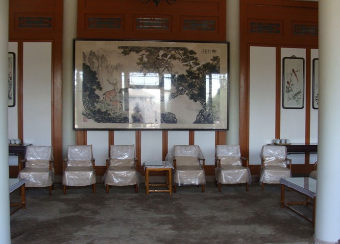 前客廳一共有五間房屋。靠東靠西的各一間用布簾與中間相隔,使中間三間室內(nèi)顯得靜謐祥和。周恩來接見外賓、會見客人等均在這中間三間房里舉行,周恩來一般坐在東邊主席位置上,西邊是主要客人的客席座位,會見時如用翻譯,就在后邊加上兩把椅子和一只小茶幾就行了。兩側(cè)是主要陪同人員坐位,如果隨行陪同人員太多,也可以臨時多放幾把椅子。周恩來在建國初期曾在這里會見原蘇聯(lián)駐中國大使羅申,原印尼總統(tǒng)蘇加諾等人。一般東側(cè)布簾內(nèi)的那間房子里放置有茶水、茶具。版權(quán)所有山東聊城聊之旅國際旅行社有限公司,轉(zhuǎn)載必究!這樣好方便工作人員隨時送上;西側(cè)布簾內(nèi)的那一間放置有小圓桌兩張。周恩來有時會見國內(nèi)外的知心客人或朋友時,談到吃飯時間了,為了節(jié)省時間,也會讓工作人員在后邊簡易鍋灶上燒幾個菜招待客人,邊吃邊談,吃完飯繼續(xù)談。象越南的胡志明主席、柬埔寨的西哈努克親王、國內(nèi)的廖承志同志等都在大廳里和周恩來一起用過餐。