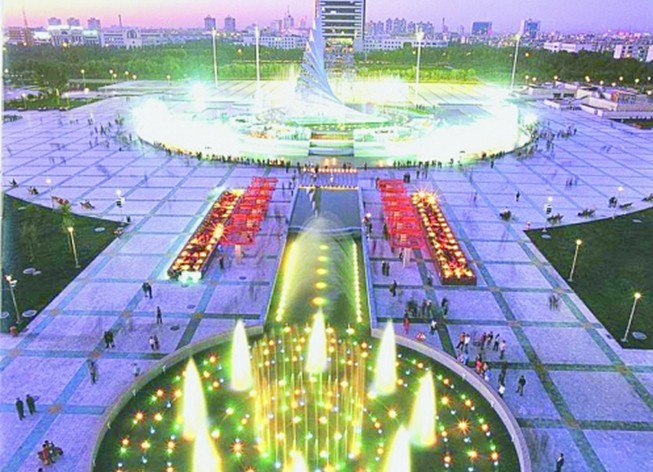 音樂噴泉是圍繞主體雕塑而設(shè)置的,分別有中心音樂噴泉,環(huán)形音樂噴泉,旱噴泉、激光水幕四部分,其中,中心音樂噴泉的4個25米高的主噴泉噴涌時,在效果燈、五彩燈和地埋燈的映照下,五彩繽紛,令人驚嘆,廣場西側(cè)的金字型建筑,就是激光水幕控制室,反映在水幕上的各種景物,都來自這個控制室的操作。