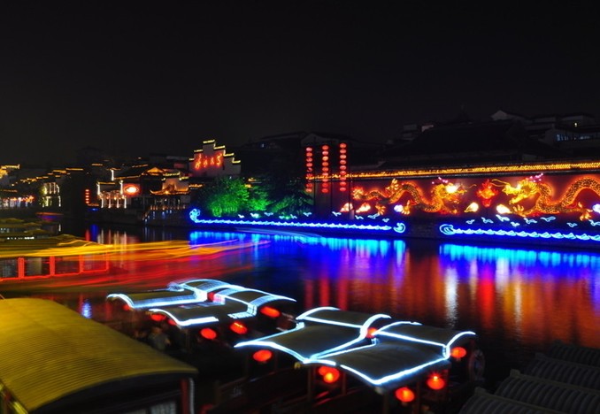 秦淮風光,以燈船最為著名。河上之船一律彩燈懸掛,游秦淮河之人,以必乘燈船為快。由朱自清名篇《槳聲燈影里的秦淮河》,可領(lǐng)略燈船豐采一二。