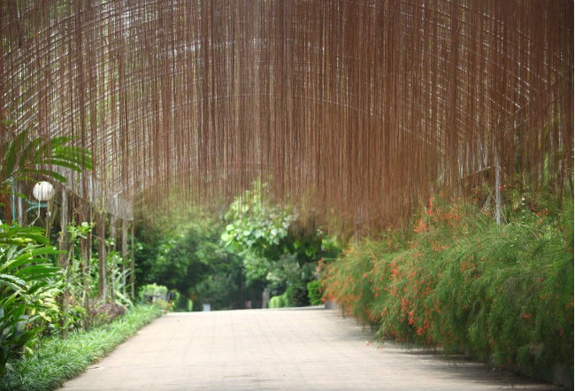 香草蘭試驗(yàn)示范基地是植物園里的第二個(gè)展區(qū)。香草蘭是一種名貴的熱帶香料植物, 素有“食品香料之王”的美譽(yù)。香草蘭是藤本植物,它們生長(zhǎng)在科研人員搭好的架子上,構(gòu)成了一片綠蔭,架子下涼快通風(fēng),可見(jiàn)香草蘭跟人一樣,也喜歡涼快。