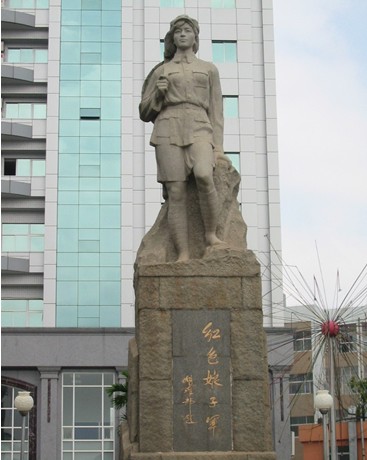 紅色娘子軍紀念雕像將紅軍女戰(zhàn)士腳穿草鞋、肩背竹笠、風塵仆仆的一代巾幗英雄的氣概充分展現(xiàn)。