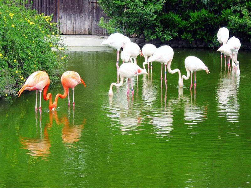 火烈鳥展區(qū)位于正大門口,共展出88只火烈鳥,有迎賓小姐的美稱,紅色的是美洲火烈鳥,粉紅色的是歐洲火烈鳥。它們有“Z”字形的長頸和鐮刀形的長嘴。此外它們還有一雙蜘蛛般的長腿,顏色發(fā)紅。它們有著獨特的淡朱紅色的羽毛。遠遠看去宛如一團火球。所以又有“火鶴”之稱更奇特的是無論它們的羽毛如何美麗,一經拔下就變成白色。它們的嘴和眼也生的與眾鳥不同:嘴細長彎曲向下,色多淡紅,基部為黃色,眼睛又細又瘦,與它們那龐大的身軀很不協(xié)調。