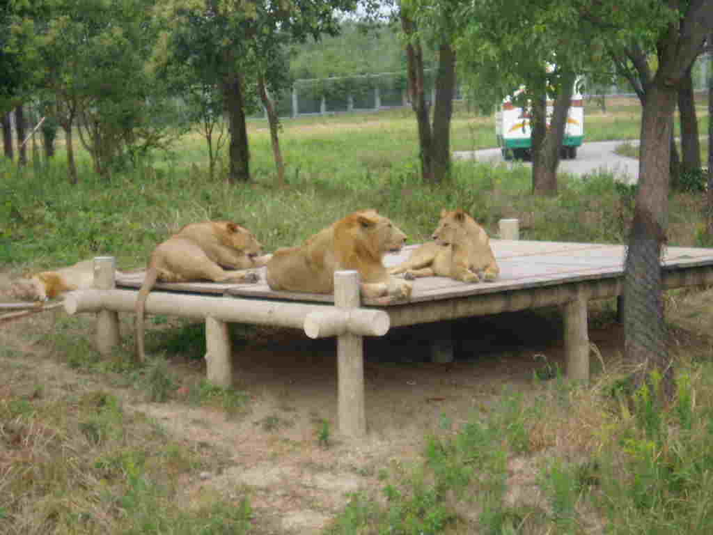 本園獅區(qū)現(xiàn)有30頭成年和14頭幼獅。展區(qū)內你看不到動物的籠舍,沒有都市里的喧囂與污染,也沒有水泥森林的壓迫感,只有滿目的青翠和回歸大自然的靜謐與清新。對每一位游客來說,乘坐游覽大巴,深入到食肉動物自由出沒的原野、叢林,是一種充滿著恐懼和刺激的歷程。進入非洲獅展區(qū),非洲獅威武的形象即刻映入眼簾,頸部與肩部披著長長的黑褐色鬃毛的雄獅常常有讓人心驚膽跳的感覺。