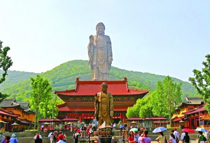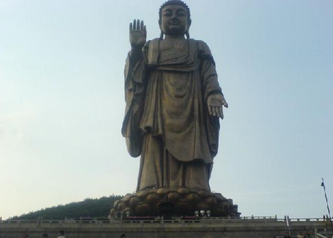 靈山的歷史可追溯到1000多年前的唐代,相傳玄奘西天取經(jīng)歸來,游歷東南到此,來到現(xiàn)在的小靈山,見“層巒叢翠”,景色非凡,大為贊賞,曰“無殊西竺國靈鷲之勝也”!于是就給此山起名小靈山。印度的靈鷲山,就是釋迦牟尼得道成佛的地方,是著名的佛教圣地,并囑大弟子窺基在這里主持開法。小靈山寺就由此逐漸發(fā)展。矗立在小靈山南麓的靈山大佛,包括蓮花座在內(nèi)通高為八十八米,相當(dāng)于一幢三十馀層樓房的高度,比“山是一尊佛,佛是一座山”的四川樂山大佛還要高出十七米,是迄今為止我國最高的巨型佛像。如果加上三層座基,總高度達(dá)一百零一點(diǎn)五米。靈山大佛雙目垂視,眼神睿智慈祥。不論游客靠近或走遠(yuǎn),似乎都在大佛眼神的關(guān)切之中;并且隨著人的靠近或遠(yuǎn)離,眼睛仿佛在微微開合,靠得愈近,眼睛就睜得愈開;嘴角似笑而未笑,欲言而未語,諸多囑咐即將出口,使人倍感親切,引發(fā)種種遐想。靠近大佛向上仰視,湛藍(lán)的天空中白云悠悠,讓人產(chǎn)生佛在“動”的感覺。靈山大佛身體各部勻稱適度,衣飾褶紋明快流暢、飄逸靈動,更增加了動感,使遠(yuǎn)觀近瞻都十分相宜。