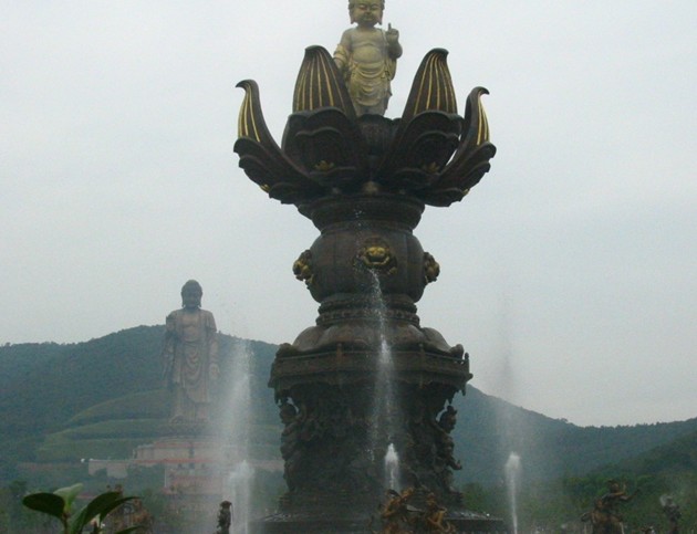 根據(jù)佛教典籍《本行經(jīng)》記載:佛祖釋迦牟尼一誕生就能說話會走路,他向東南西北四個方向各走了七步,每走一步,地上就開出一朵蓮花。他一手指天,一手指地,說道:“天上天下,唯吾獨(dú)尊”,這時候花園里忽然出現(xiàn)了兩方池水,天空中出現(xiàn)九條巨龍,吐出水柱,為其沐浴凈身。這個故事十分神奇,讓人浮想聯(lián)翩。更難得的是,靈山勝境的大型音樂動態(tài)群雕“九龍灌浴,花開見佛”再現(xiàn)了故事中的絢麗景象。在九龍灌浴廣場,我們可以看到一座含苞待放的巨大蓮花銅雕矗立在前方,巨大的荷花由四個威武的大力士托起,底部襯托著白色的圓形大理石水池,九條飛龍和八個形態(tài)各異的供養(yǎng)人環(huán)繞著巨大的水池。