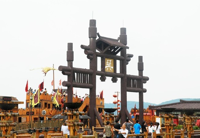 大道前方,豎立著三座高大的轅門,這就是曹營(yíng)水旱寨了。它由曹操點(diǎn)將臺(tái)、轅門、四座敵樓和樓船組成,是《三國(guó)演義》中“火燒赤壁”、“橫槊賦詩(shī)”、“草船借箭”等戲的拍攝所在。曹操點(diǎn)將臺(tái)兩側(cè),戰(zhàn)鼓矗立,版權(quán)所有山東聊城聊之旅國(guó)際旅行社有限公司,轉(zhuǎn)載必究!依稀可見一代梟雄曹公當(dāng)年的威儀。站在三層高的點(diǎn)將臺(tái)上,極目遠(yuǎn)眺,水寨風(fēng)光盡收眼底。陸地上的樓臺(tái)堂榭與湖上的望江敵樓相峙對(duì)望,讓人驚嘆設(shè)計(jì)者的獨(dú)具匠心和建造者的巧奪天工。整個(gè)曹營(yíng)還是“火燒赤壁”這場(chǎng)戲的拍攝地。據(jù)統(tǒng)計(jì),在拍攝“火燒赤壁”這場(chǎng)戲時(shí),就動(dòng)用了九臺(tái)攝像機(jī)、一架直升機(jī),從空中、陸地、水上同時(shí)進(jìn)行拍攝。剎時(shí),火光沖天,烈焰翻騰,東西綿延500米的曹營(yíng)成為一片火海。曹營(yíng)內(nèi),古樸雄偉的大轅門連接一條80米長(zhǎng)、6米寬的甬道直通曹操樓船,三層高的樓船固定于湖面,游人扶舷撫艙之際,遙想1700多年前曹公躊躕滿志、橫槊賦詩(shī)的慷慨之情,頓生“是非成敗轉(zhuǎn)頭空”的滄桑之感。