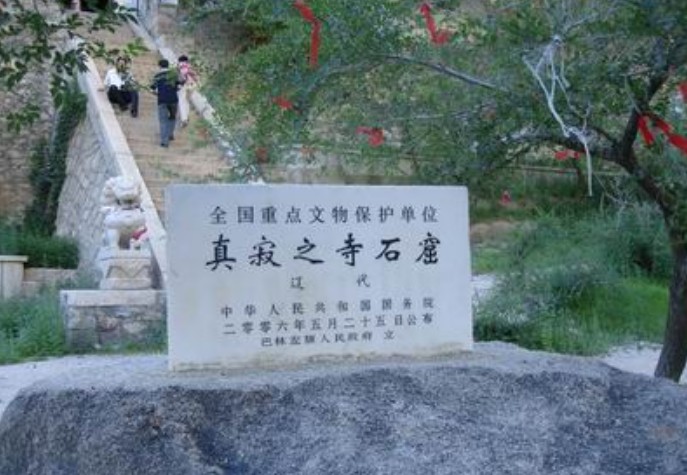 遼代石窟“真寂之寺”即林東后召廟石窟寺。其寺位于遼上京南15公里的山谷中。石窟開鑿在桃石山東南面陡壁上,分中、南、北三窟??咔笆乔宕m(xù)建的喇嘛廟“善福寺”。中窟眉額刻“真寂之寺”四個大字,當為遼代開鑿石窟的題名。“真寂”二字與中中窟內(nèi)釋迦牟尼“圓寂”之意相合。窟內(nèi)釋迦臥佛像周圍有佛弟子像若干,做悲哀狀??弑谟星Х鹣癜儆嘧?,形象各異,南窟雕像中間為佛,騎獅子和象的文殊、普賢二菩薩分列兩邊,又有供養(yǎng)人服侍,窟門口有金剛力士像。北窟分內(nèi)外兩室,外室雕像同于南窟,內(nèi)室造像均為浮雕,有佛、弟子和供養(yǎng)人,兩側(cè)刻有胡服裝束力士像一對,頗具特色。桃石山谷口兩側(cè)緣石壁立有兩尊金剛力士浮雕,十分生動,一東一西,各自把定金剛杵,足踏耐熏二鬼,另在巖壁和巨石之上多有清代陽刻梵文:“六字真言”。“真寂之寺”附近的山谷中還有石窟若干,其中有遼史所記弘福寺及開化寺遺址,諸多跡象表明這里是遼、清兩代弘揚佛法的對地。