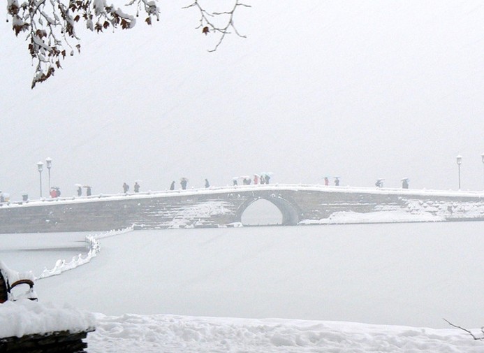 每當(dāng)瑞雪初霽,站在寶石山上向南眺望,西湖銀裝素裹,白堤橫亙雪柳霜桃。斷橋的石橋拱面無遮無攔,在陽光下冰雪消融,露出了斑駁的橋欄,而橋的兩端還在皚皚白雪的覆蓋下。依稀可辯的石橋身似隱似現(xiàn),而涵洞中的白雪奕奕生光,橋面灰褐形成反差,遠(yuǎn)望去似斷非斷,故稱斷橋。