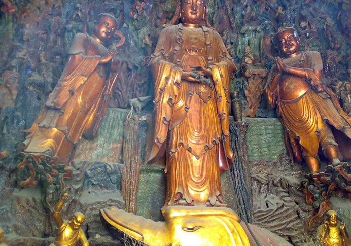 過天王殿為庭院,院中古木參天,正面是大雄寶殿,重檐高33.6米,十分雄偉。大殿正中是一座高24.8米的釋迦牟尼蓮花坐像,造像“妙相莊嚴”、“氣韻生動”,是一件不可多得的宗教藝術作品。正殿兩邊是二十諸天立像,殿后兩邊為十二圓覺坐像。大殿后壁有“慈航普渡”、“五十三參”海島立體群塑,共有佛像150尊,正中為鰲魚觀音立像,手執(zhí)凈水瓶,普渡眾生,下塑善財童子,說是善財童子拜觀音的故事,善財童子參拜名師53位,第27參拜見觀音得道成佛。觀音兩側為第子善才與龍女,上有地藏菩薩,再上面是釋迦牟尼雪山修道的場景:白猿獻果、麋鹿獻乳,整座佛山造型生動,很有藝術價值。
